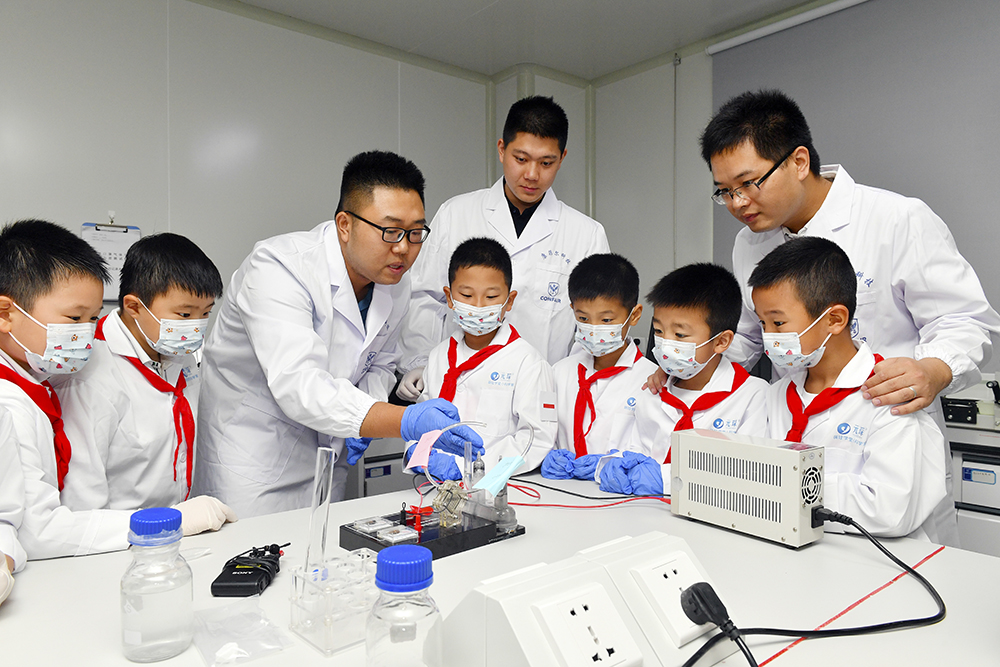 Entering the laboratory on the third floor, Liu Sutao and Shen Guangyu, R&D engineers of the Institute, led two groups of children to conduct experiments on calcium carbonate production of carbon dioxide and electrolytic water production of hydrogen and fuel cell power generation respectively. Among them, the experiment of carbon dioxide production by calcium carbonate is to produce carbon dioxide by calcining limestone at high temperature or by reacting limestone and dilute hydrochloric acid. Through the chemical reaction, bubble-like carbon dioxide appeared in the test tube and the water became cloudy. The munchkins kept their eyes open to witness the magical moment.