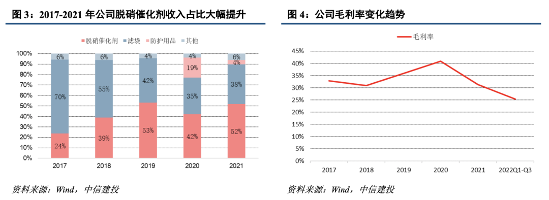 公司主要从事过滤材料、烟气净化系列环保产品的研发、生产、销售,主要产品为各类耐高温耐腐蚀滤袋和 SCR 脱硝催化剂,可应用于电力、钢铁及焦化、垃圾焚烧、水泥和玻璃等行业。2017-2021年公司营业收入CAGR为17.11%,归母净利润CAGR为18.35%。