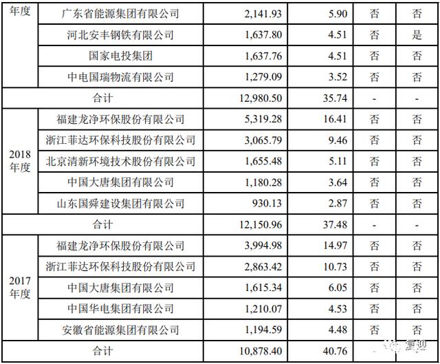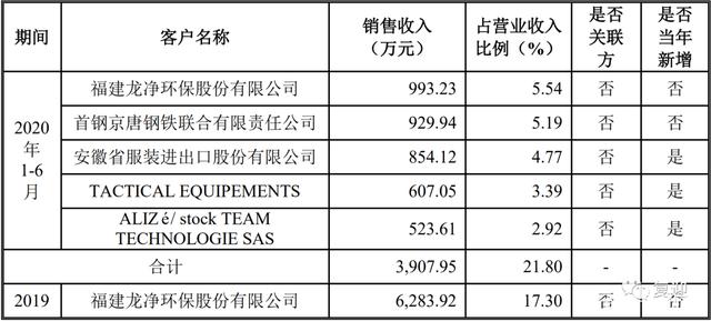 2019年公司前五大客户实现营收1.30亿元,占比35.74%,其中第一大客户龙净环保实现营收6283.92万元,占比17.30%。