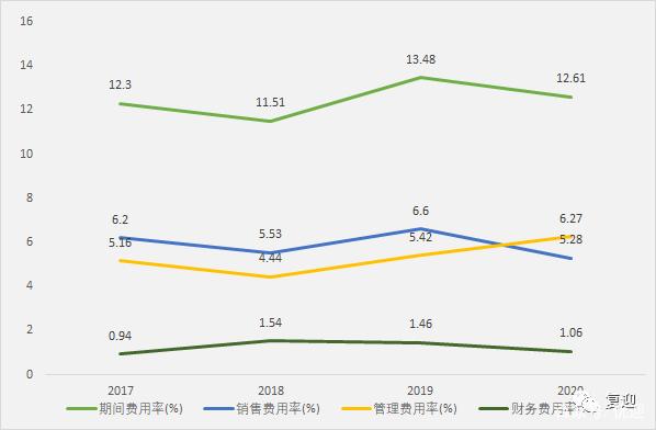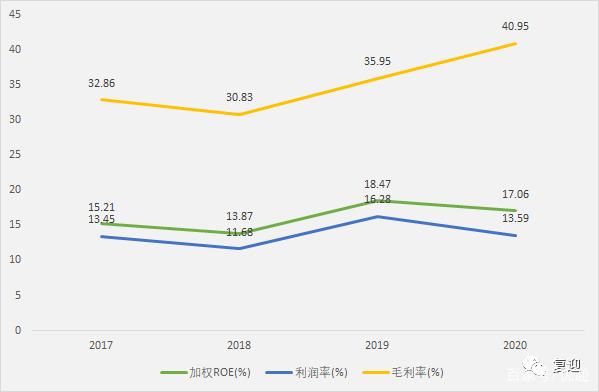 2017-2020年,毛利率18年下降至低点30.83%,随后逐年提高至40.95%;期间费用率18年下降至低点11.51%,19年提高至高点13.48%,20年下降至12.61%,其中销售费用率19年上涨至高点6.60%,20年下降至5.28%,管理费用率18年下降至低点4.44%,随后逐年上涨至6.27%,财务费用率18年上涨至高点1.54%,随后逐年下降至1.06%;利润率18年下降至低点11.68%,19年提高至高点16.28%,20年下降至13.59%,加权ROE18年下降至低点13.87%,19年提高至高点18.47%,20年下降至17.06%。