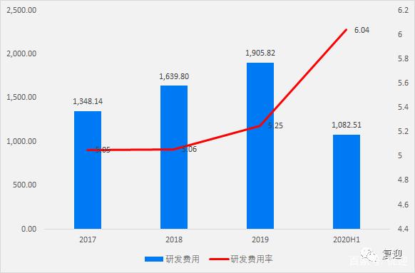 2017-2020H1公司研发费用分别为1,348.14 万元、1,639.80 万元、1,905.82 万元和 1,082.51 万元,占比分别为 5.05%、5.06%、5.25%和 6.04%。